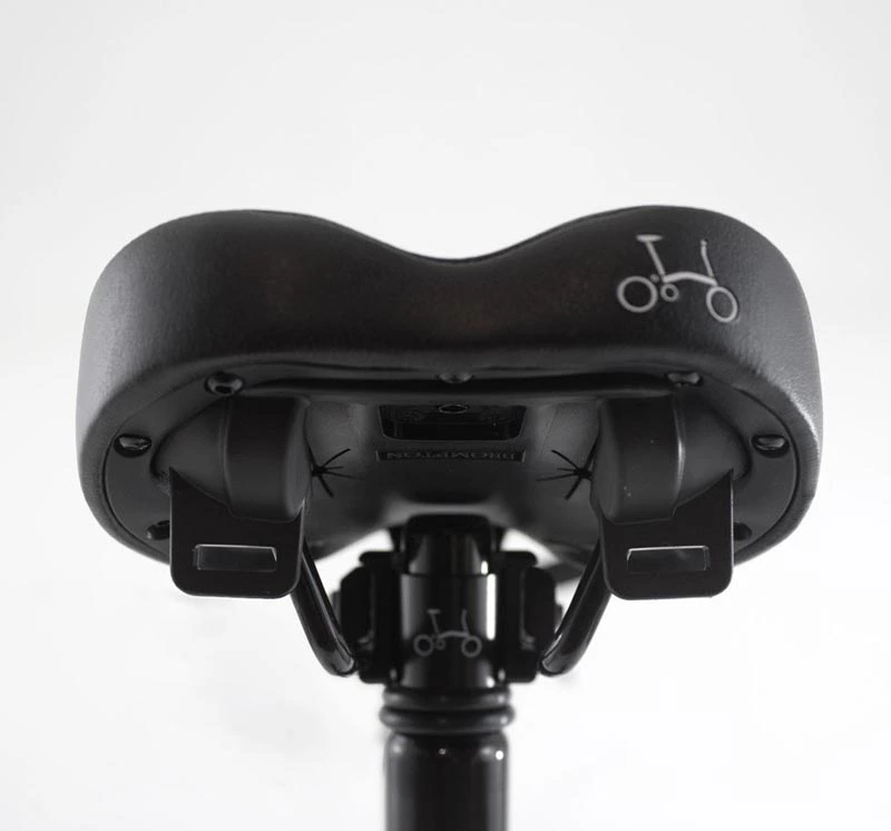 Tähän mustaan satulaan saa kiinitettyä todella kätevän Brompton Cateye Rapid Mini satulavalon