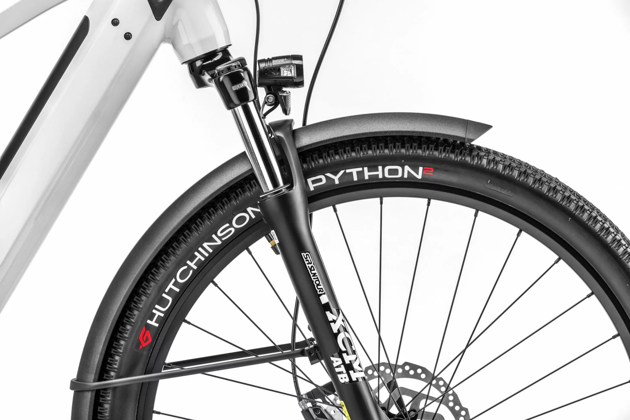 Etujousitus on Suntour XCM ATB HLO 80mm joustolla, esijännityksen säädöllä ja lukituksella. Hutchinson Python 27.5″ x 2,1″ renkaat ovat erinomainen valinta sekä hiekkateille, helpohkoille poluille tai kestopäällysteelle.